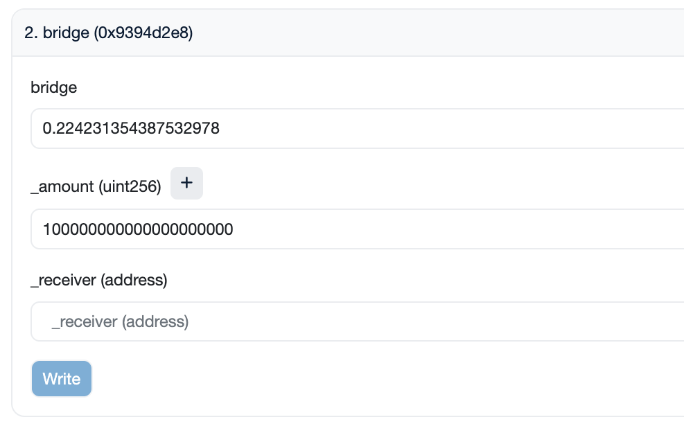 bridge: Enter the ETH amount quoted in Step 2. Ensure you enter the amount denominated in Ether (quoted amount / 1e18)._amount: Specify the amount of tokens in 1e18 format._receiver: Enter the wallet you wish to receive the tokens to.