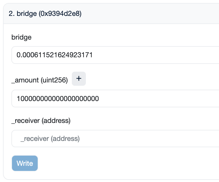 bridge: Enter theETHamount quoted in Step 2. Ensure you enter the amount denominated in Ether (quoted amount / 1e18)._amount: Specify the amount of tokens to bridge in 1e18 format._receiver: Enter the wallet you wish to receive the tokens to.