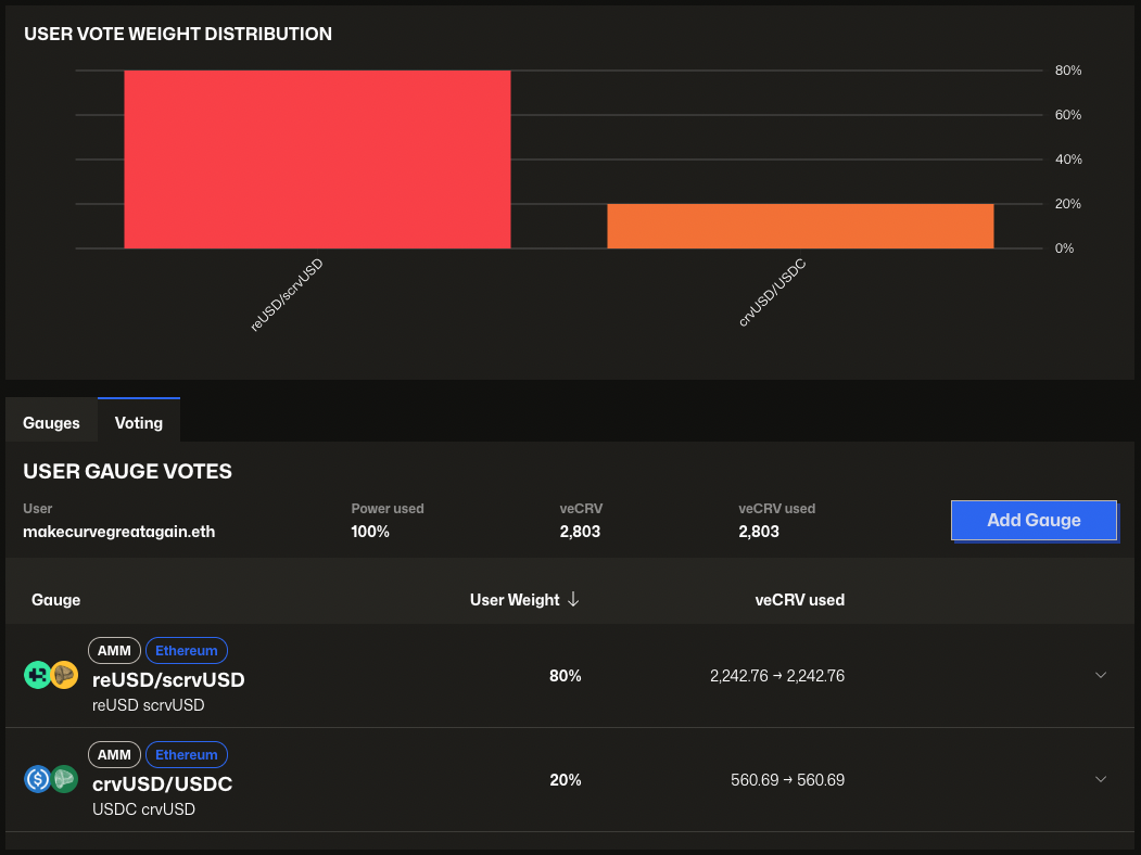 You previously allocated 80% of your voting power to the reUSD/scrvUSD gauge. You can reduce it to 60%, and immediately reallocate the freed-up 20% to other gauges.