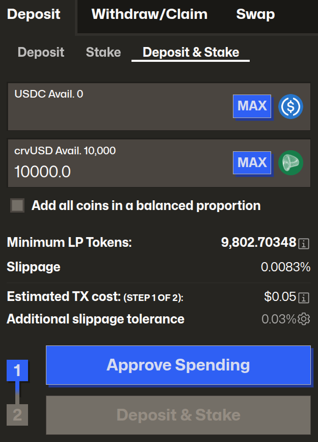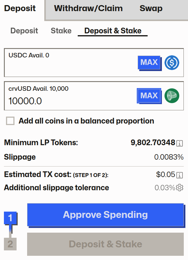 Now on the crvUSD/USDC pool page, we can see the deposit menu to the left and choose deposit & stake and choose how much we'd like to deposit, here we are depositing $10k crvUSD: