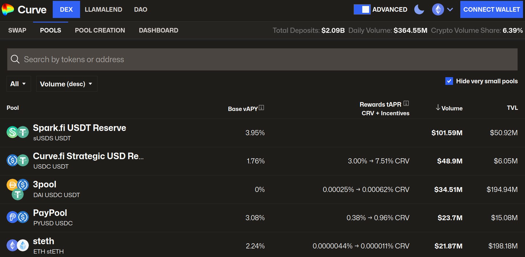 The pools overview above shows a list of all the available pools on that network, you can also search for an asset you would like to deposit, e.g., crvUSD, CRV, etc.