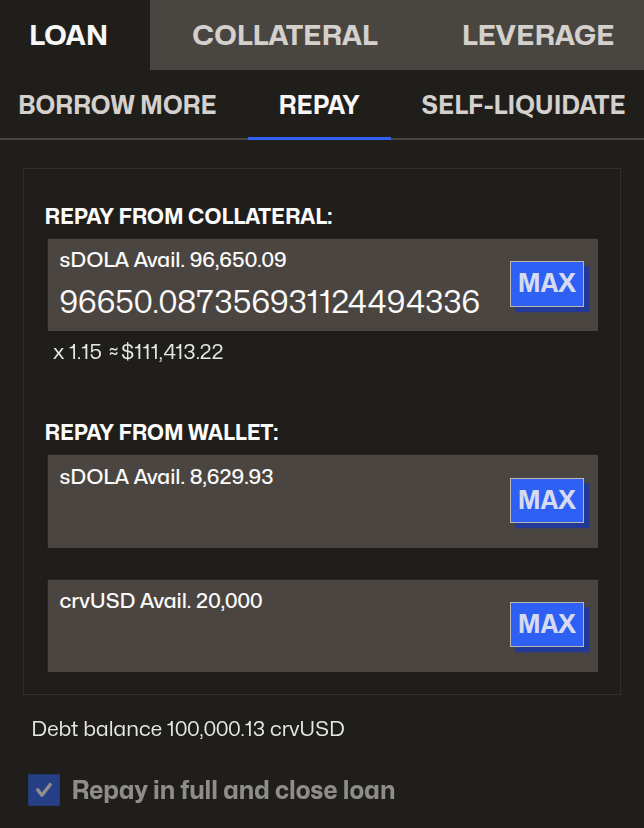 When closing a leveraged loan by repaying with collateral, you will receive your collateral back in the borrowed token (crvUSD above), instead of your original collateral (sDOLA above).