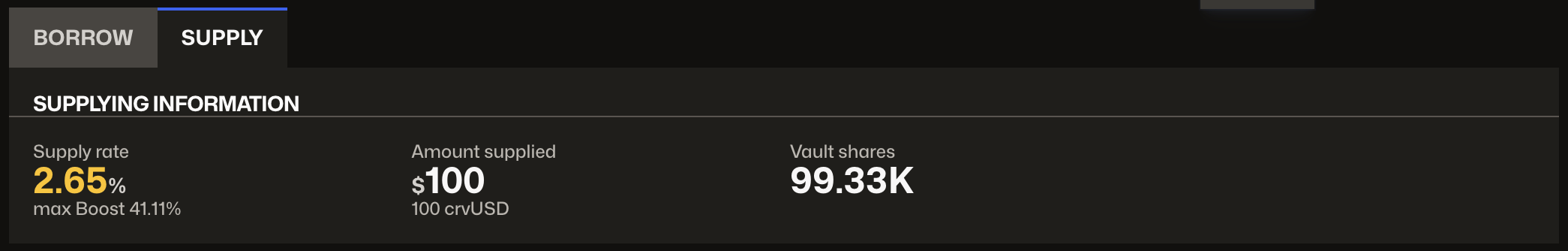 When hovering over the supply rate, a tooltip will appear explaining the composition of the total rate (base yield, CRV emissions, etc.).