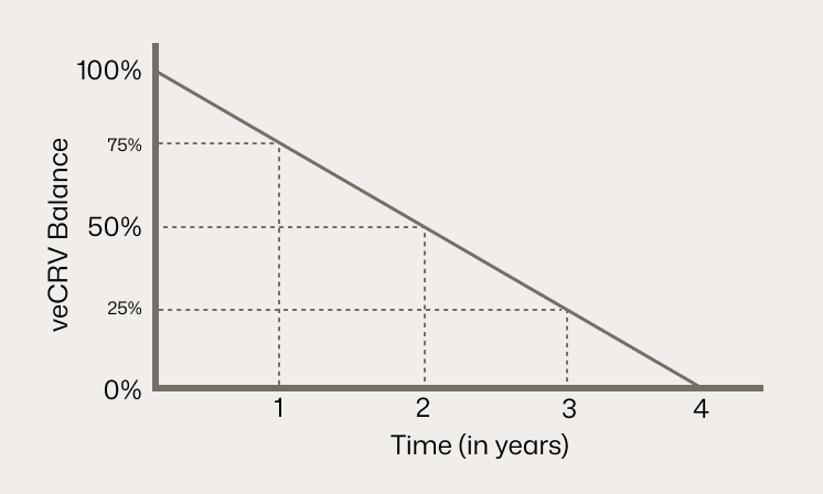 When users lock their CRV, the amount of veCRV they receive depends on both the quantity of CRV locked and the length of the lock. For example, locking 1 CRV for the maximum period of 4 years grants users 1 veCRV, while locking the same amount for just 1 year gives users 0.25 veCRV. This relationship is defined by a simple formula: