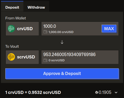 After entering your amount, you'll see how many scrvUSD vault tokens you'll receive. In the example below, if we deposit 1,000 crvUSD, we would receive 953 scrvUSD. This is because scrvUSD is designed to continuously grow in value against crvUSD (1 scrvUSD = 1.049 crvUSD).
